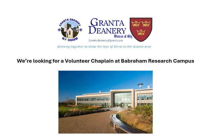 The Granta Deanery seeks to appoint a volunteer chaplain for two days per week at BRC. This role offers a trusted presence for staff and visitors, extending the ministry of Wednesday@ and supporting the Deanery’s wider aspiration for chaplaincy across the science and innovation parks of South Cambridgeshire.